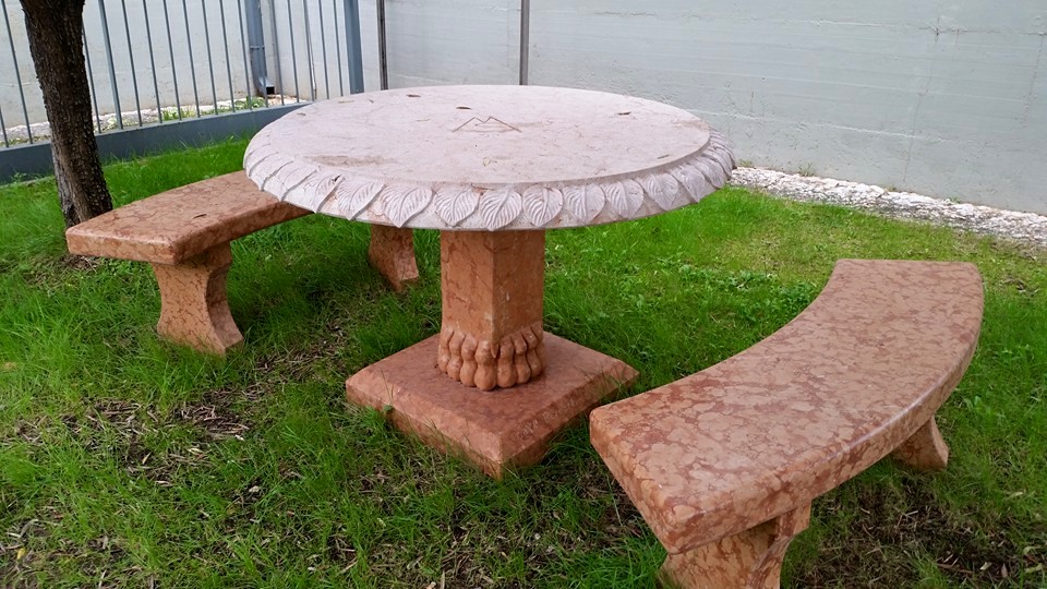 Maßgefertigtes Set bestehend aus einem runden Tisch und zwei passenden runden Bänken, handgefertigt aus Rosso Verona und Nembro. Die Kombination mit den passenden Terrassendielen verwandelt jeden Gartenbereich in ein Zentrum der Begegnung und des Austauschs.